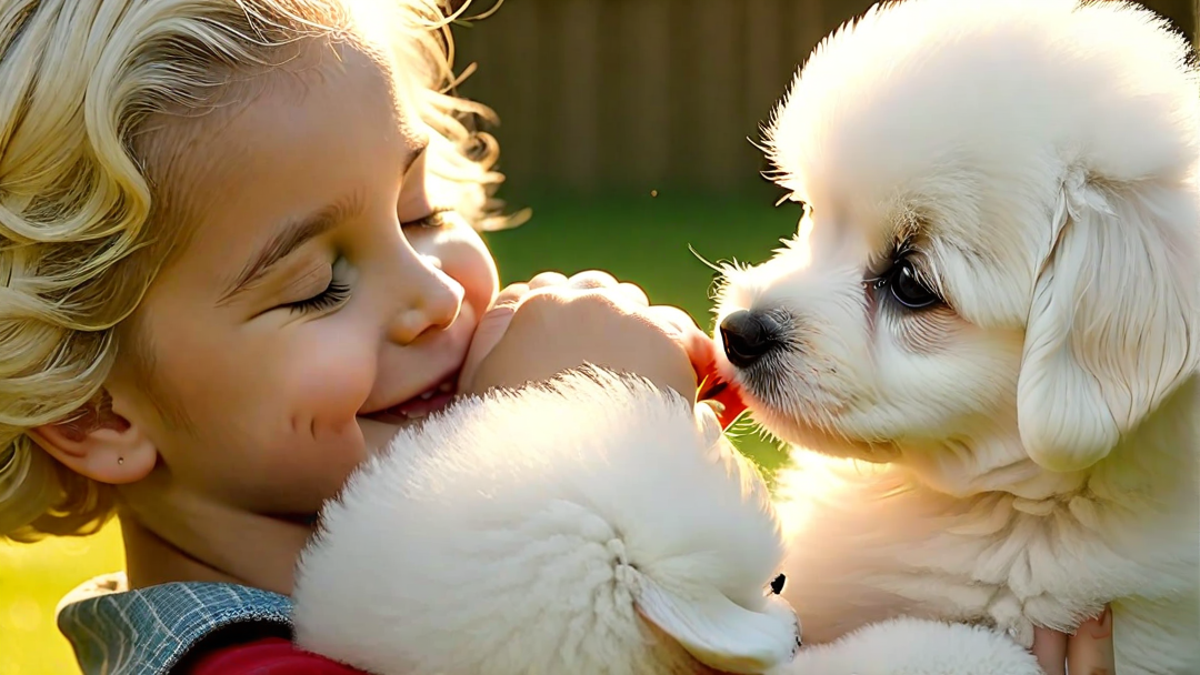 Each Bichon Frise puppy, with its distinctive soft, puffy coat and cheerful demeanor, seems to dance around the newcomer, who is charmed by the warmth of their welcome. The scene is filled with playful barking and the soft rustling of grass as they all embark on what promises to be a delightful adventure of friendship and play. This moment beautifully captures the essence of youth and camaraderie, set against the backdrop of a bright, sunny day that adds a touch of magic to their first encounter.